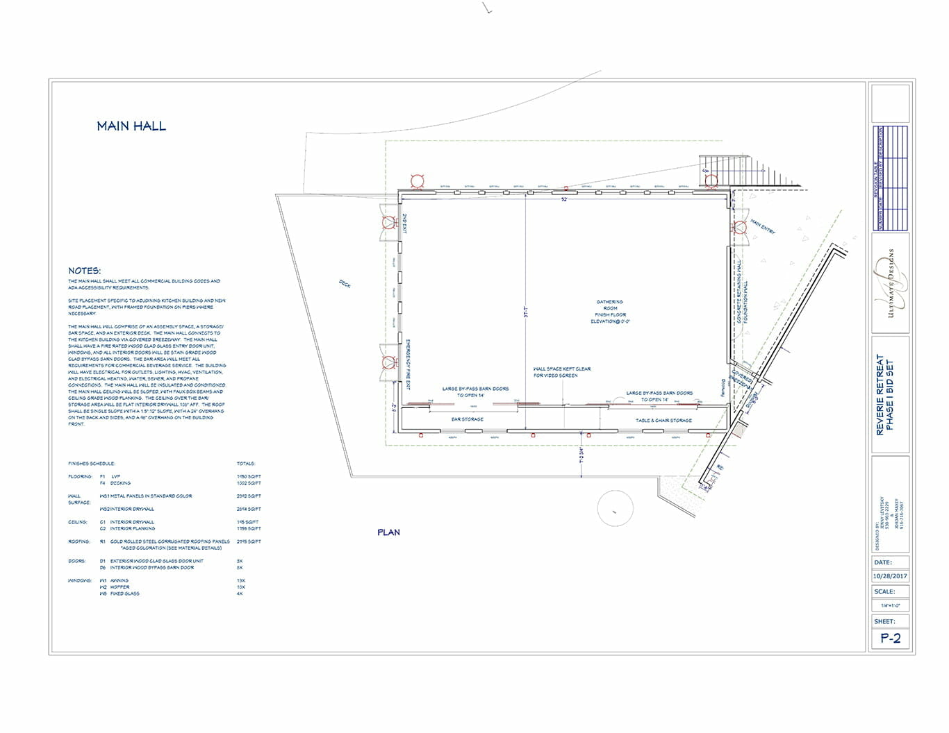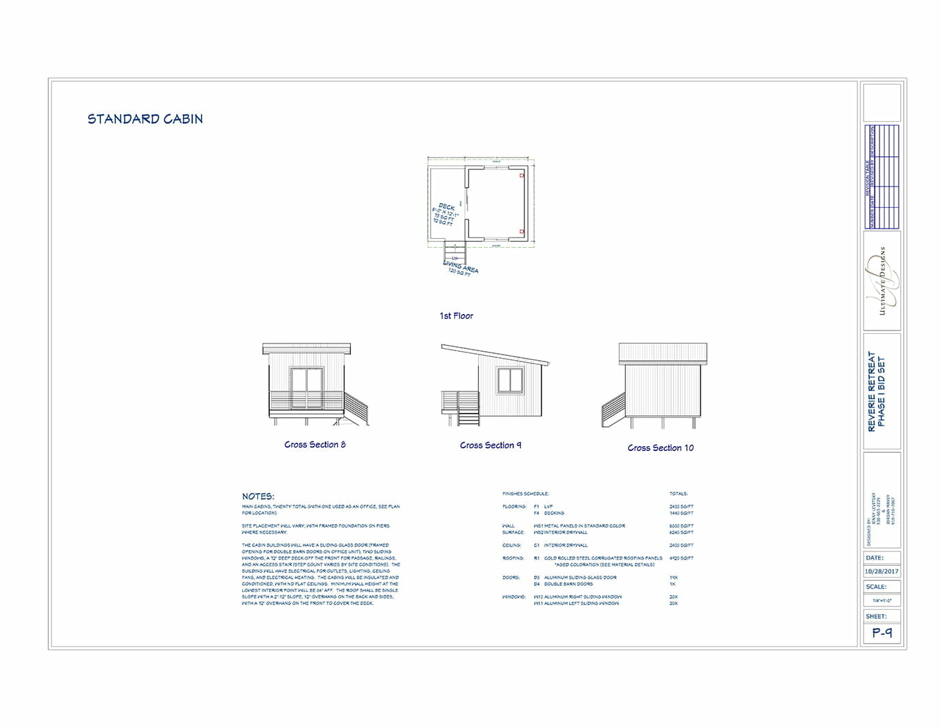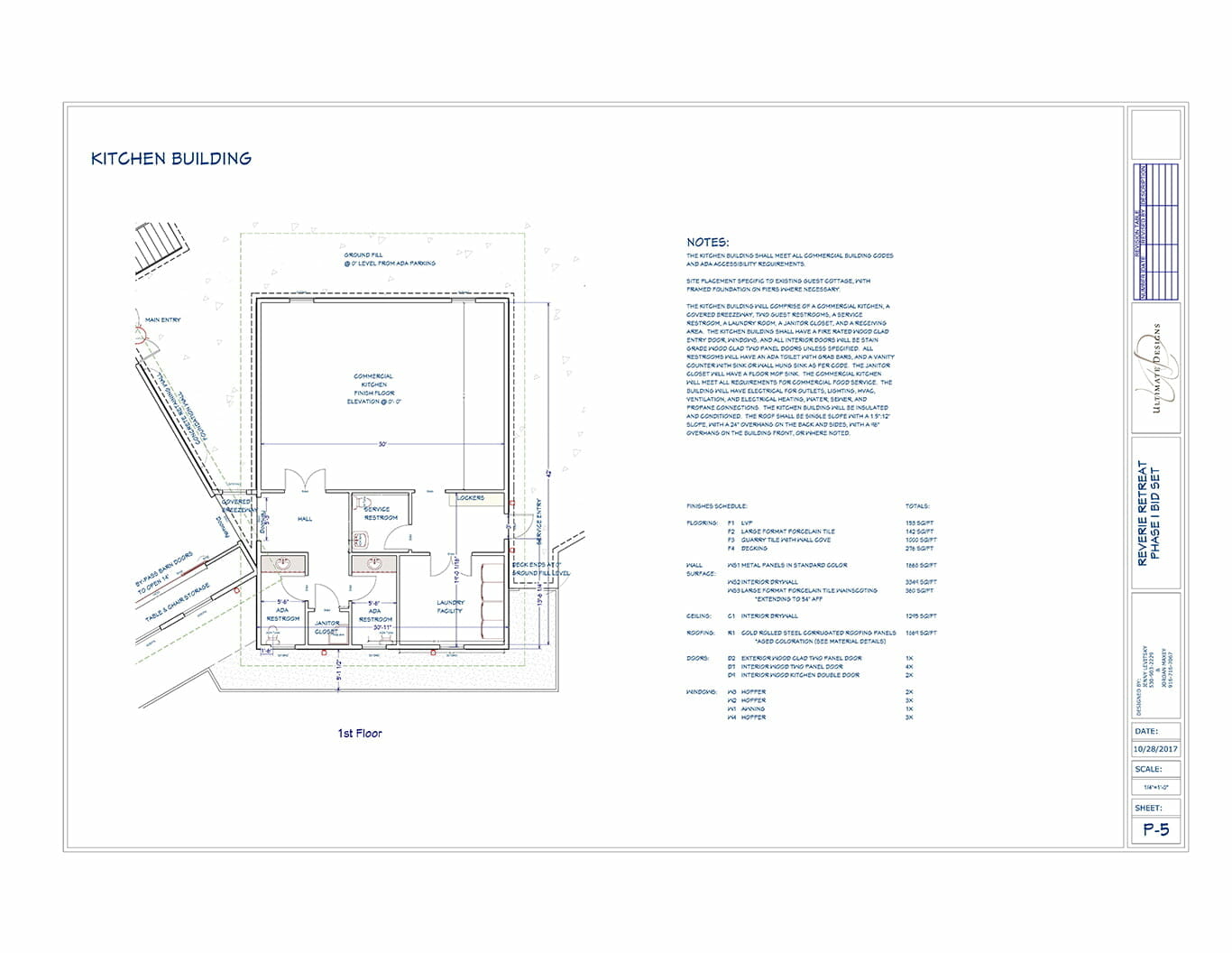 As your eye progresses from right to left on the plan, picture yourself walking down the driveway, past the two cars on the left. The first building you come to on the left is an ADA cabin with an ADA parking space adjacent to it. The next building on the left is the existing guest cottage, then you come to the commercial kitchen building that includes restrooms (both guest and staff), laundry facility and janitor room. The last large building on the left is the 1800 sq. ft. main hall. Across the road from the gathering space is an outdoor dining pavilion with a small outdoor kitchen and another ADA bathroom. The cabins are the small buildings scattered about further to the left on the plans (as you walk down the hill). There are three small buildings with toilets, sinks, and showers located in the middle of all of the cabins.