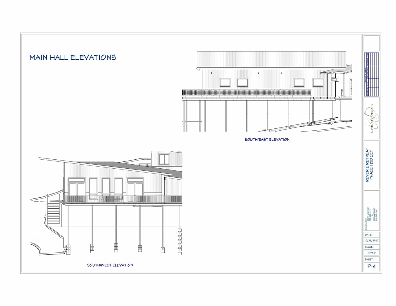 Here is a blueprint of the main hall, followed by several elevation drawings from different views and a rendering: