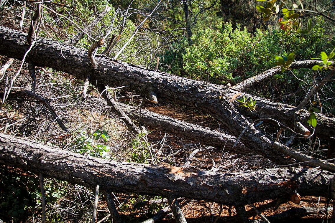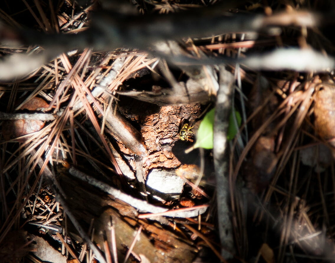 I started to clear the brush from around the base of this huge tree when I suddenly felt something hurting on the top of my head… I looked around and saw hundreds of wasps swarming all around me and I started to run. Of course, since I was surrounded by fallen trees, I could not run but had to first scramble under and over logs to get to a clear path.